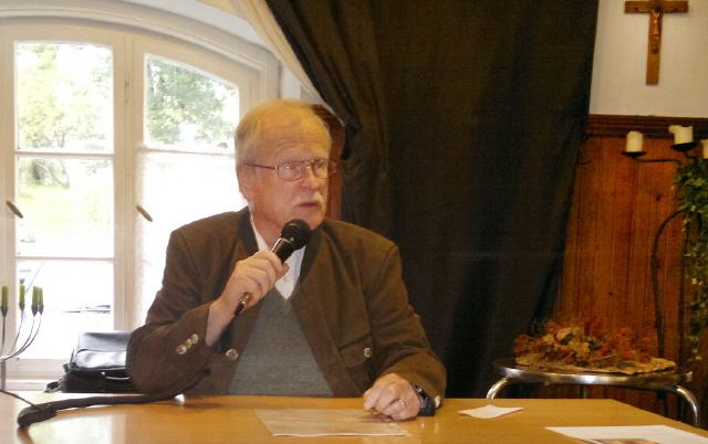 Holunder im Teigmantel, Grießnockerlsuppe – die Wirtin trägt auf. Der Moderator Gerwin Degmair, auf dem Podium erhöht, trägt gelassen die Veranstaltung – mit sonorer Stimme zitiert er Saint Exupéry: die wirkliche Weite ... die alles verbindende Sprache.