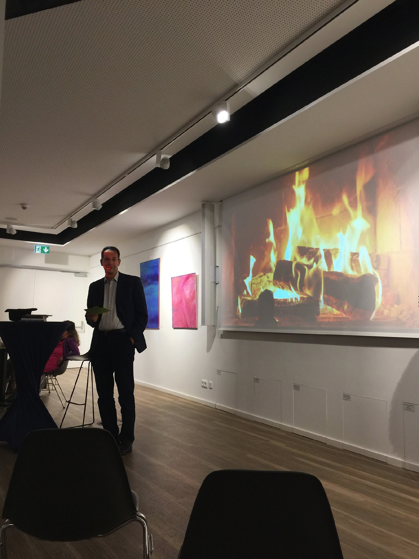 „Bücher sind Schiffe, die die weiten Meere der Zeit durcheilen.“ Mit diesem Satz von Francis Bacon leitete Moderator Dr. Boris Schneider über zum Anfangsbild. Nach der „Taufe“ sei es nun an der Zeit, die Buch-„Kinder“ mit anderen zu teilen. Während das große Kaminfeuer aus dem Beamer munter an der Wand prasselte, schlenderten also Zuhörerinnen und Zuhörer zum Büchertisch und nahmen sich etwas mit, um den Genuss am heimischen Kamin fortzuführen.