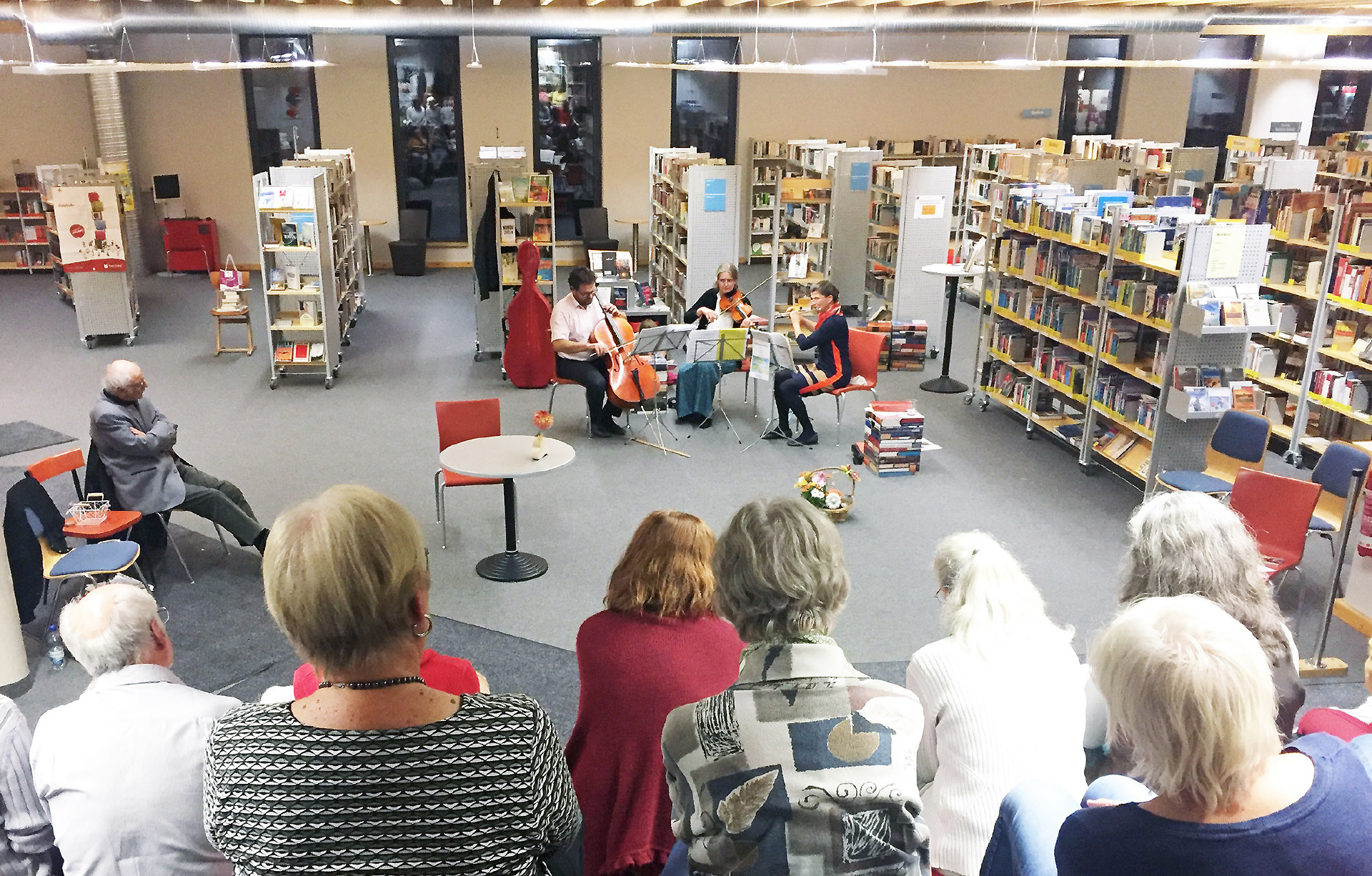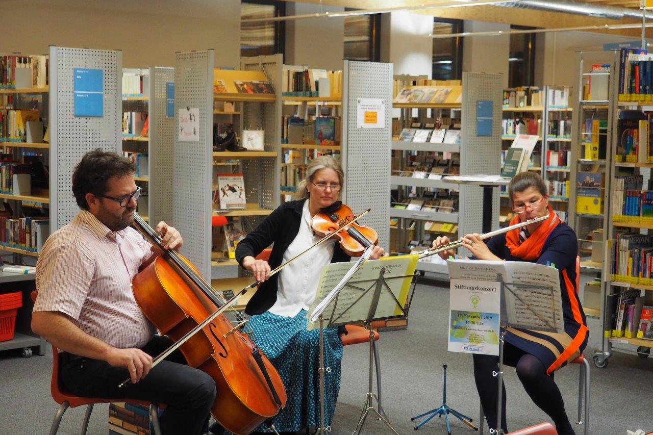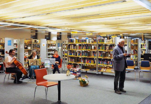 In das fröhliche Begrüßungsgeplapper mischten sich zunehmend musikalische Töne. Das Kauferinger Kammertrio hatte seine Plätze eingenommen und stimmte die Instrumente. Dr. Anna-Katharina Freifrau von Schnurbein setzte die Querflöte an, neben ihr strich Annegret Fischer-Fey über die Violine und ihr Mann Michael Fey das Cello. „Johann Sebastian Bach“ prangte von der Spielpartitur. Um 19 Uhr waren die Besucherränge gut gefüllt, als Monika Hecht alle begrüßte. Zum sechsten Mal bot ihr Arbeitsplatz nun schon den beeindruckenden Rahmen für die alljährliche Vorstellung der Bücher einzelner Autoren aus dem Landsberger Autorenkreis.