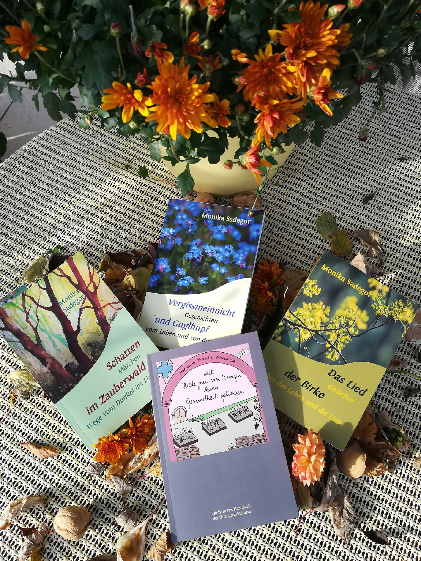 Monika Sadegor stelle sich auf ihrer Homepage als dichtende Psychologin vor, so Helmut Glatz, die auch Philosophie studiert hatte. In leitenden Positionen tätig, war sie es gewohnt, Neues anzupacken und zu erledigen. Derselbe Schwung packte sie im Ruhestand, als sie 2018 die Buchvorstellung der Autorenkollegen erlebte. Da waren doch noch Gedichte aus den letzten 20 Jahren in der Schublade, die sollten veröffentlicht werden. Das geschah im März 2019, und weil es solche Freude machte, gab sie im Mai, fast noch pünktlich zum Muttertag, die Erinnerungen an ihre Großmutter heraus, liebevolle Geschichten von ihrer Kindheit in Passau. Ein Aufenthalt am Lago Maggiore überraschte sie dann selbst mit der Inspiration zu fast einem Dutzend Märchen – im September hielt sie auch dieses Werk in Händen. „Das Lied der Birke“, „Vergissmeinnicht und Gugelhupf“ und „Schatten im Zauberwald“ sind drei Bücher, wie sie unterschiedlicher kaum sein können.