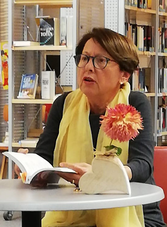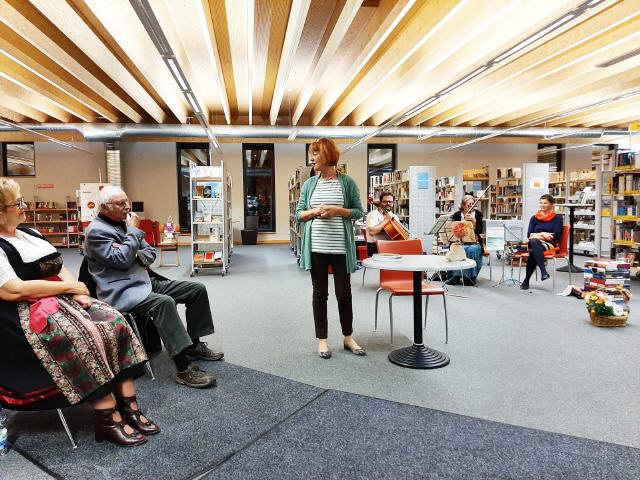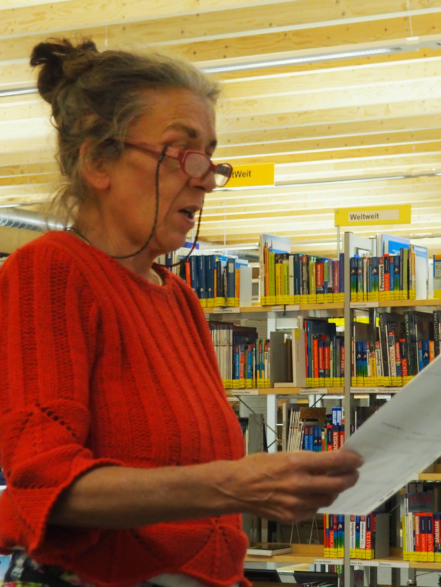 Endlich eine echte Kauferinger Autorin!, bejubelte der Moderator Monika Hrastnik. Sie las „Oktoberintermezzi“ von Herbstlaub und Sturmtief, von Wildem und Trübem und davon, wie in mancher Nacht die Sterne besonders funkeln. Bunt und Schön wechselten zuweilen ins Hässliche, doch im letzten Tanz treten alle ihre Reise an und „Erinnern ist, was übrig bleibt“.