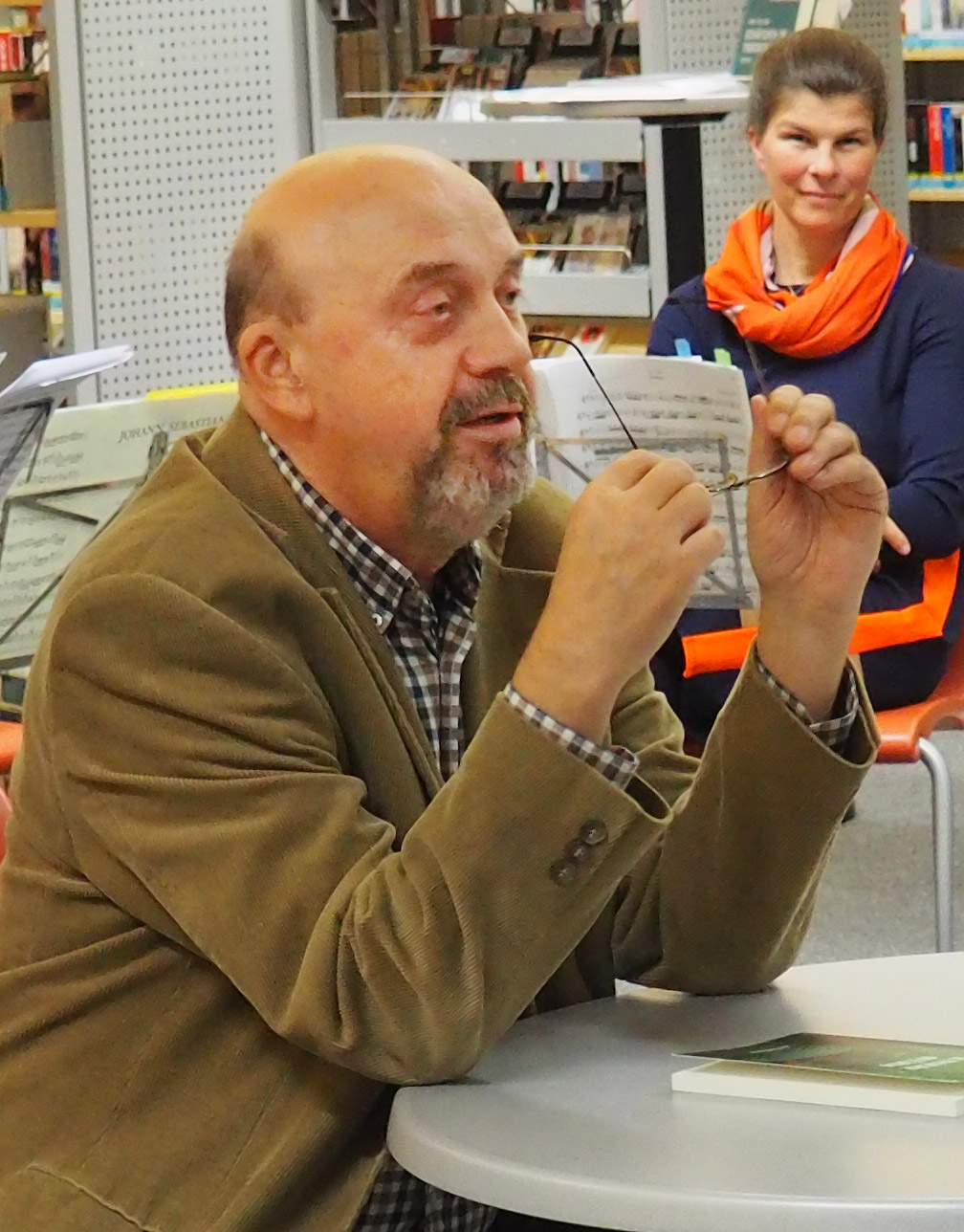 Ja und dann die Pause: Die Zuhörer strömten zum Büchertisch der Autorinnen, es wurde gestöbert und gefachsimpelt, gelesen und gekauft … bis die Bücher ausgingen. Bei so viel Gesprächsstoff wurde beinahe überhört, dass die Musiker wieder spielten. Vivaldis „Winter“ sei gewiss auch zimthaltig, teilten sie mit einem Augenzwinkern mit. Schwungvoll eröffnete der Moderator gleich die zweite Leserunde des Abends. Die Namen der lesenden Autoren wurden, wie sonst in diesem Kreis üblich, mittels Losverfahren gezogen und bestimmten die Reihenfolge.