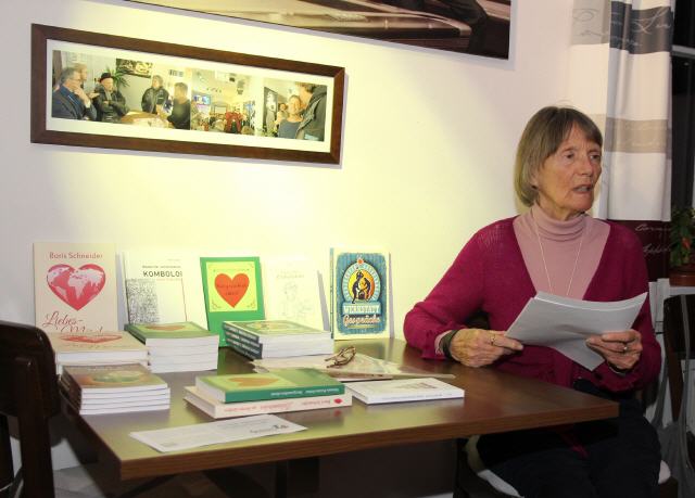 Um die bunte Mischung des Abends abzurunden, las Martje Herzog-Grohmann zum Abschluss noch eine Passage aus ihrem kurz vor Drucklegung befindlichen Roman einer Kindheit in Kriegszeiten, „Ich dachte, Frieden gäb’s nur im Märchen“. Ihr empathischer und frohsinniger Erzählstil weckte Vorfreude auf das Erscheinen ihres Buches.