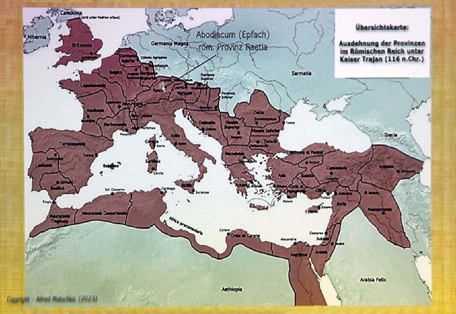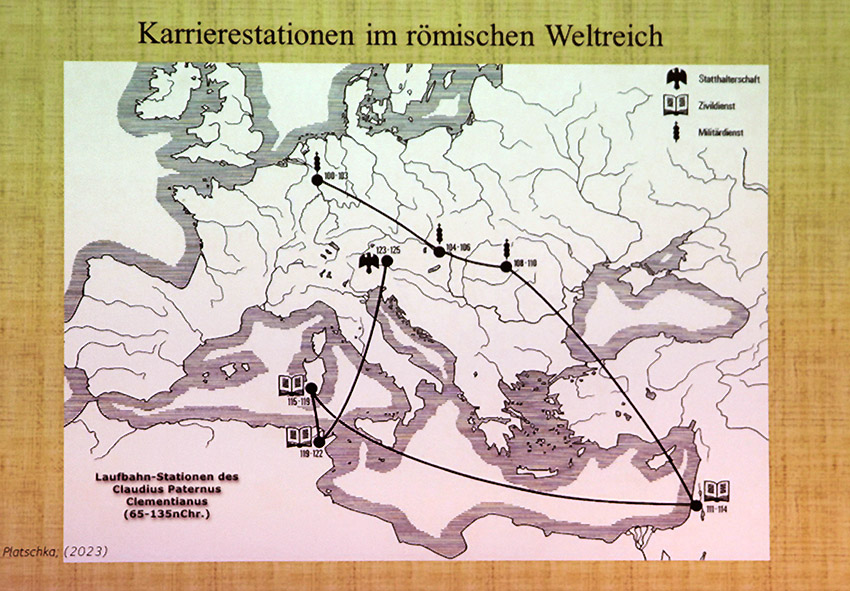 Gedenksteine erinnern heute noch an den römischen Weltreisenden: Einen setzte er selbst für seine Mutter Claudia Clementi (der Vater hieß Paternus), einen weiteren stiftete seine Tochter für sein Grab und verewigte darauf seinen ungewöhnlich weiten und langen Lebensweg etwa bis ins Jahr 135 n. Chr. Grafische Übersichten, Karten und Abbildungen stützten in einem kurzen Lichtbildvortrag die Ausführungen von Alfred Platschka und gaben dem römischen Leben in unserem Landkreis und in Europa vor 2000 Jahren Kontur.