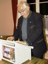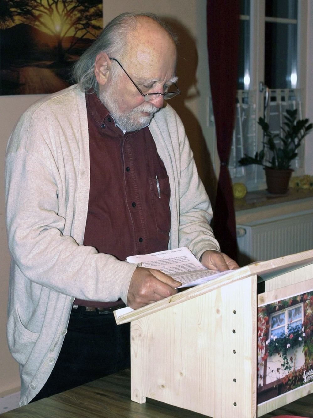 Paul H. Wendland aus Hohenfurch forderte die volle Konzentration des Publikums. Das hohe Niveau seiner Lyrik entfaltete er in mächtigen Sprachbildern wie der „sternenumfunkelten Silberbarke“ (dem Mond) oder der Metapher über Lyrik, die „von unsichtbaren Bäumen reife Gedankenfrüchte pflückt“. Sie entstammen seinem Buch „Ein Wortefinden in der Schule des Lebens“.