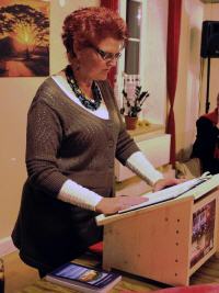 Angelika Müller aus Oberbergen erwies sich als Künstlerin in Wort und Bild; ihre Suche nach dem verlorenen Wort beeindruckte die Zuhörer ebenso wie die „Kaskaden in Orange“, die sie bei einem Sonnenuntergang meisterhaft beobachtet hatte.