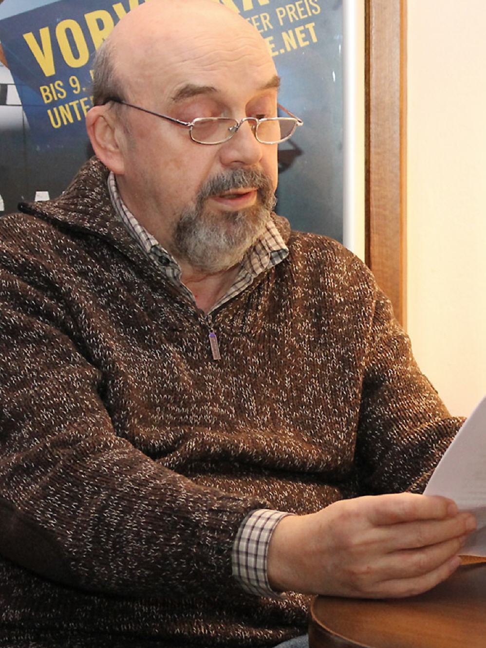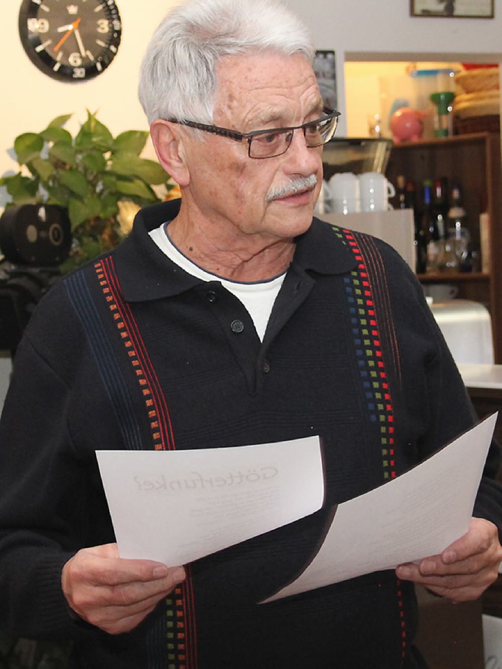 „Götterfunke!“ Dieses zündende poetische Gesangsgedicht von Fred Fraas war genau das Richtige zum Neuanfang der geteilten Lesung. Doch mit dem „Märchen, dass jedes Paar sich ewig liebt“ setzte er gewissen Höhenflügen ein jähes Ende, denn „bohrt der Wurm der Widrigkeit“, dann sättigt man schon bald „nur den Hirnstammrand“. Nur wenige seien Herr jener Macht, die zu unterscheiden weiß zwischen „wie wunderbar du bist“ und „… du zu sein meinst“. So ist dann allzu oft statt Götterfunke „schon wieder braune Tunke“ am Dampfen.