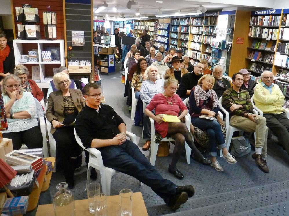 Geschäftsführer Robert Reuter hieß die Autoren bereits zum zweiten Mal willkommen. Der Einladung folgten auch zahlreiche literaturbegeisterte Besucher der Kunstnacht. Die vielen vorbreiteten Stühle reichten kaum für Leser und Zuhörer. Doch auch stehend konnte man dem Zusammenspiel von Worten und Musik lauschen. Dazwischen wurde mal eben in einem Buch geschmökert, und man entschloss sich womöglich zum Kauf. Erfreulich war auch das junge Publikum, Kinder, die sich einfach auf den Boden setzten und eine Weile zuhörten.