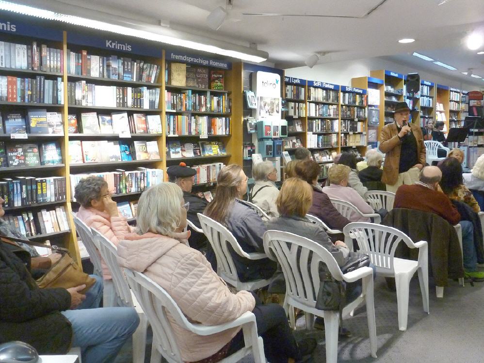 Moderatorin Heidenore Glatz hatte zu „Lyrischen und anderen Kostbarkeiten“ eingeladen. Und bald erfüllte das Zusammenspiel von Dichtergut und Klassik tatsächlich die gut „gefüllte“ Buchhandlung. Rund 18 Autoren wechselten sich am Lesepult ab. So mischten sich Lyrik und Prosa unentwegt unter das begeisterte Publikum, verpackt als Tiefgreifendes, Mundartliches, Nachdenkliches, Selbsterlebtes, neu Erdachtes oder tierisch Satirisches. Nicht selten heiter Eingestreutes rundete den Leseabend ab.