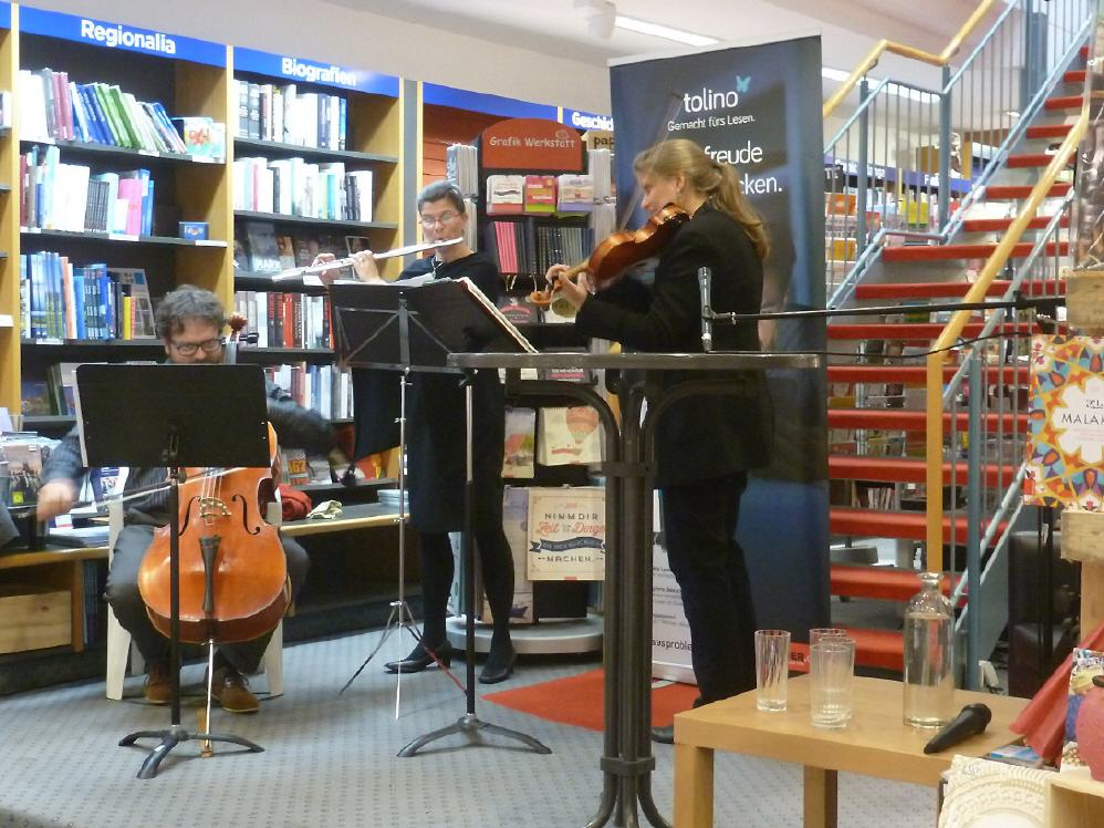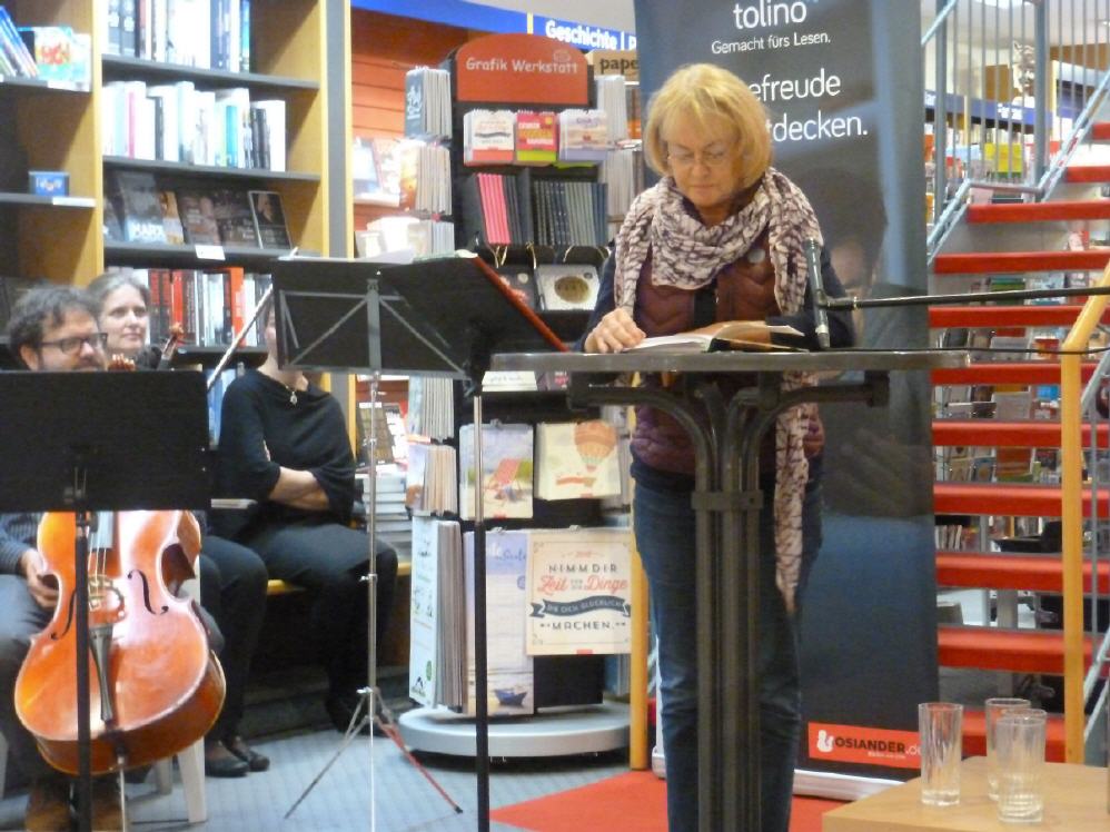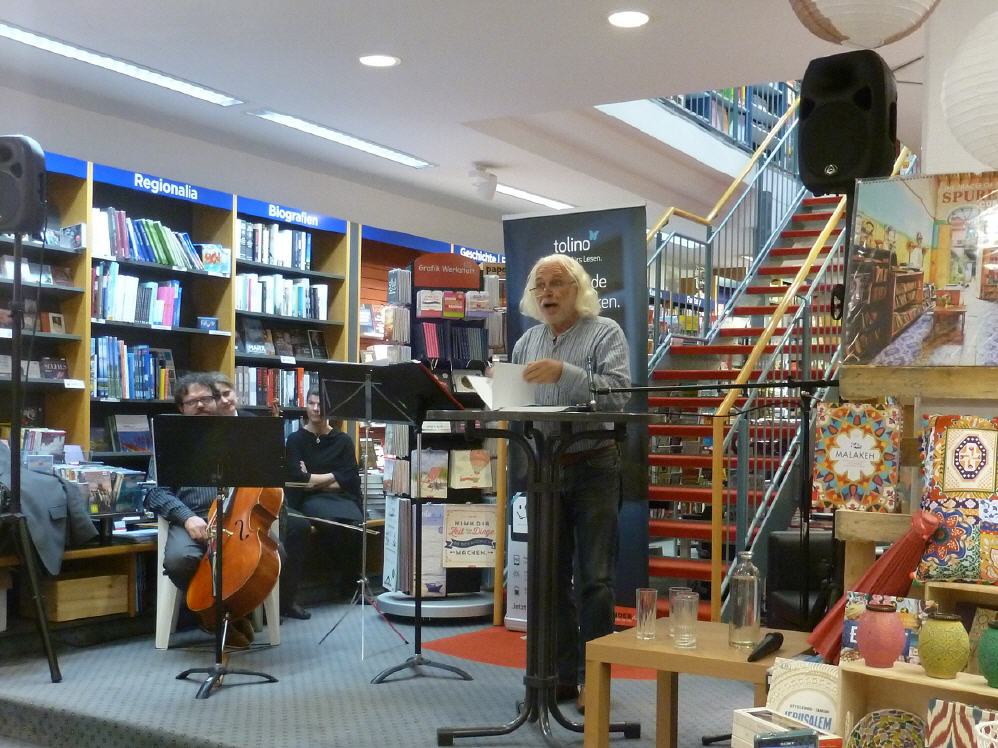 Das harmonische Ineinandergreifen von lokaler Literatur und klassischer Musik bewog viele Besucher dazu, lange in der Buchhandlung zu verweilen, und ermutigte damit auch die Lesewilligen zum Weitermachen. Wenn ein Autor in seinen Text abtaucht, vergisst er schon mal die Zeit und lässt sich von seinen in Worte gefassten Gedanken einfach treiben. Kräftiger Applaus ist ihm ein himmlisches Geschenk. Herzlichen Dank Herrn Reuter und seinem Team für das Ermöglichen dieses belebten, kurzweiligen Abends in der Osianderschen Buchhandlung!