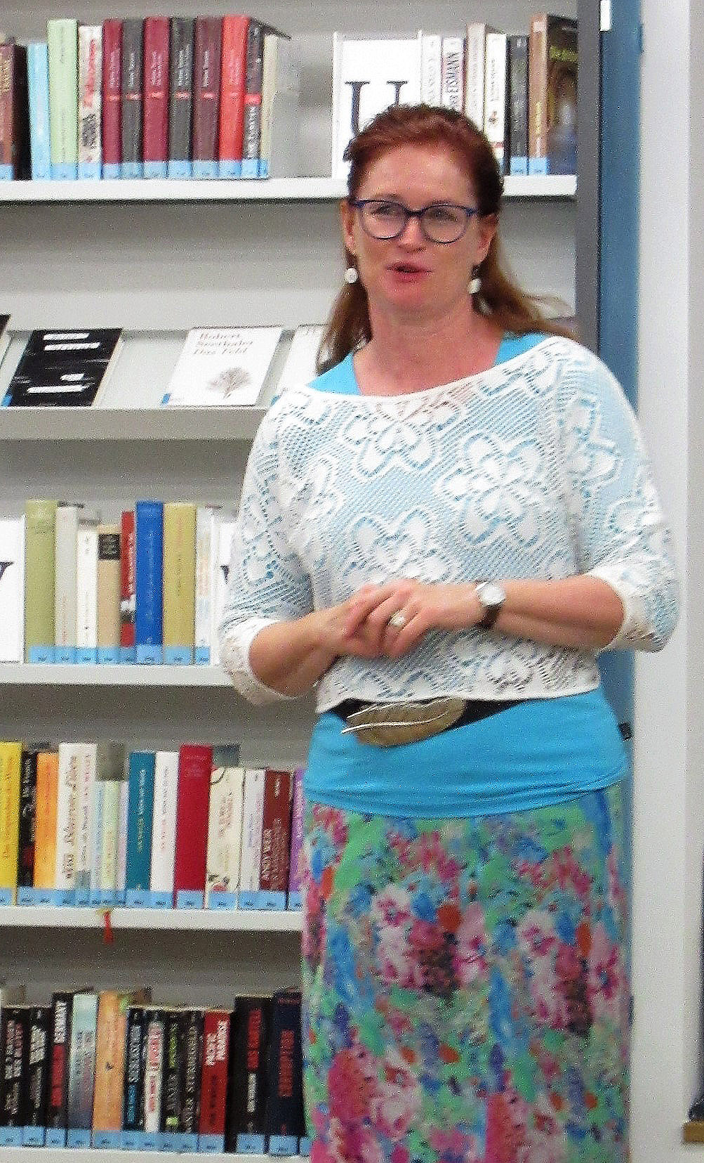 Als die Bücherei um 19 Uhr offiziell ihre Pforten geschlossen hatte, begrüßte Gudrun Dietsche-Böhm von der Stadtbücherei Buchloe Zuhörer und Gäste. Unter Verweis auf das am Vortag gefeierte 70-jährige Jubiläum des deutschen Grundgesetzes las sie Artikel 5 zur Meinungsfreiheit vor und freute sich, dass bei uns jeder seine freie Meinung äußern darf.