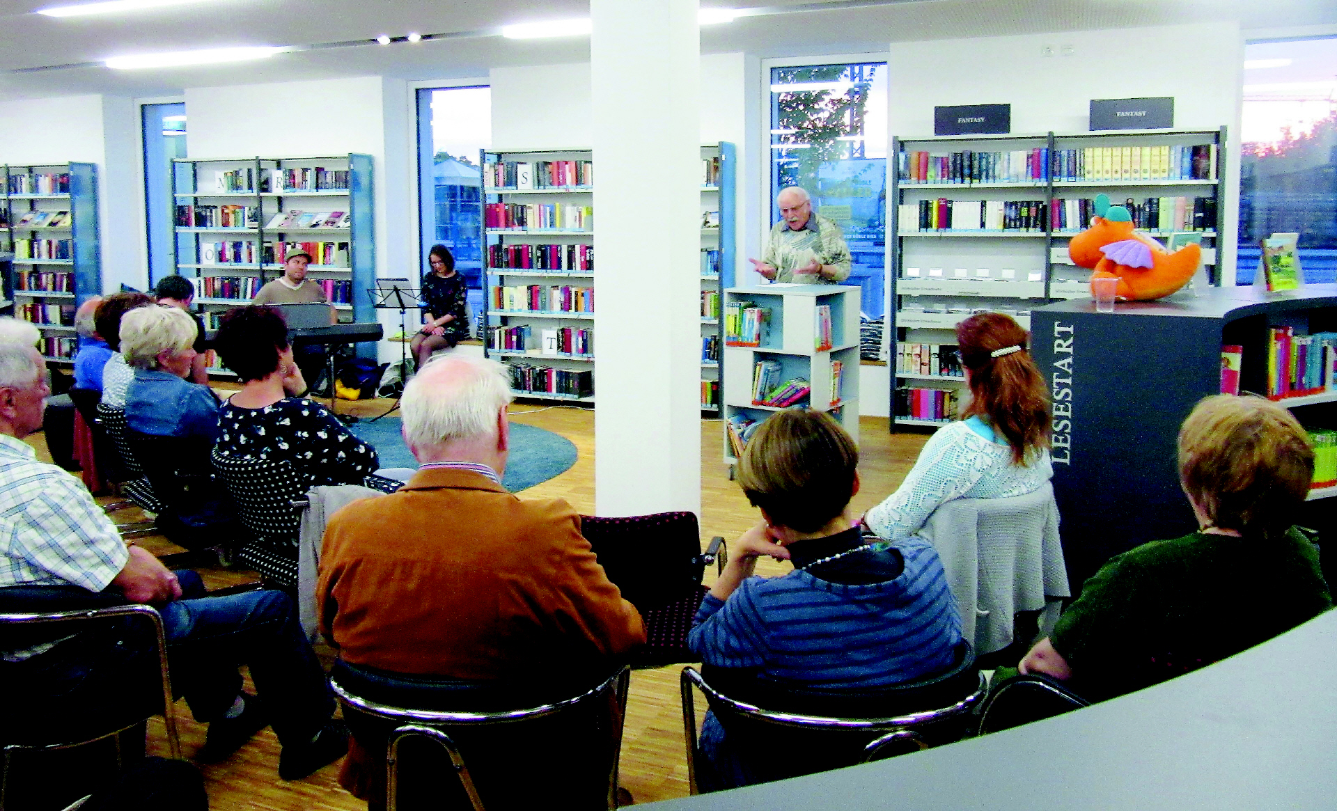 Autoren und Zuhörer waren sich am Ende der Veranstaltung einig: Die neue Stadtbücherei ist eine kulturelle Bereicherung. Hoffentlich wird es hier noch viele weitere Veranstaltungen geben. – Wer den gesamten Text bis hierhin gelesen hat, wird schon selbst festgestellt haben, dass trotz der engen Themenvorgabe „Märchenhaft“ wieder eine erstaunliche Bandbreite verschiedener Texte vorgetragen wurde. Durch das angenehme Ambiente und die gelungene musikalische Begleitung war die Jungfernlesung in der Stadtbücherei Buchloe auch aus Sicht des Landsberger Autorenkreises ein voller Erfolg.