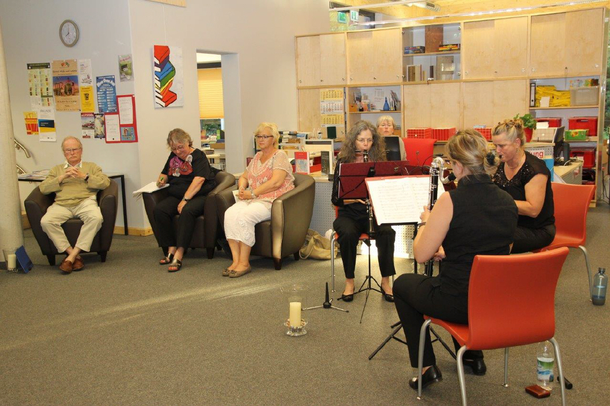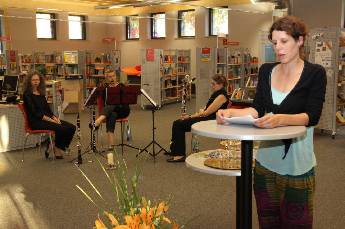 Vor der Pause ließen die „KlariNetten“ leichte Melodien zur vorgetragenen Lyrik tanzen. Und als Einleitung nach einer kurzen Pause flatterten sie wie Schmetterlinge den nächsten Vorträgen entgegen. Hier begann Joachim Giebelhausen mit einer Satire auf den Tod. Er schilderte eine Reise im Jenseitsexpress, die zurück ins Diesseits führte. Heidi Glatz nahm die Zuhörer dann mit in den Urlaub. Mit kurzweiligen Gedichten sprach sie über das Essen und die Menschen am Strand. Die „KlariNetten“ würzten dies mit leichtfüßigen Klängen. Hannelore Warreyn schenkte den Anwesenden Melancholisches über Romantik, späte oder zu späte Begegnungen und hoffte, dass die Zeit doch endlich Wurzeln schlagen möge. Die „Expressionistin“ Renate Exsz legte noch facettenreiche, mit Worten gemalte Bilder, die von kleinen Engeln, Müttern oder Wolken erzählen, auf den Gabentisch. Marianne Porsche-Rohrer gab zum Abschluss gute Ratschläge zum Ausgleich für stressgeplagte Mitbürger.