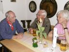 vertrat als erster Max Dietz. In seinem Gedicht „Häia doch aaf“ verarbeitet er die Traumata von „däi bläida Vawandschafd, „däi damischn Bolidika“, „däi neimodischn Urnen“ – ach, „häia doch aaf!“ Dass alte Menschen sich manchmal überflüssig fühlen in der modernen Gesellschaft und Familie, hinterfragt er in „Wos sagsd dou du?“ Was ist, „wennsd dousitzt und blous nu stäiasd“, das hörte sich in der Übersetzung ins Lechrainische so an: „Blòss sitzà und ’n Weeig umgäàsch“. Mit dieser Sequenz, die Hans Schütz vorlas, gedachten sie des im letzten Oktober verstorbenen Autorenkollegen Otto Stedele, der mit dieser Übersetzung im Kreis der Mundart-Autoren wieder auflebte.