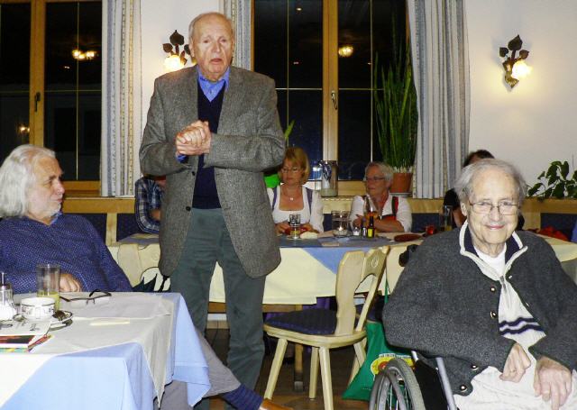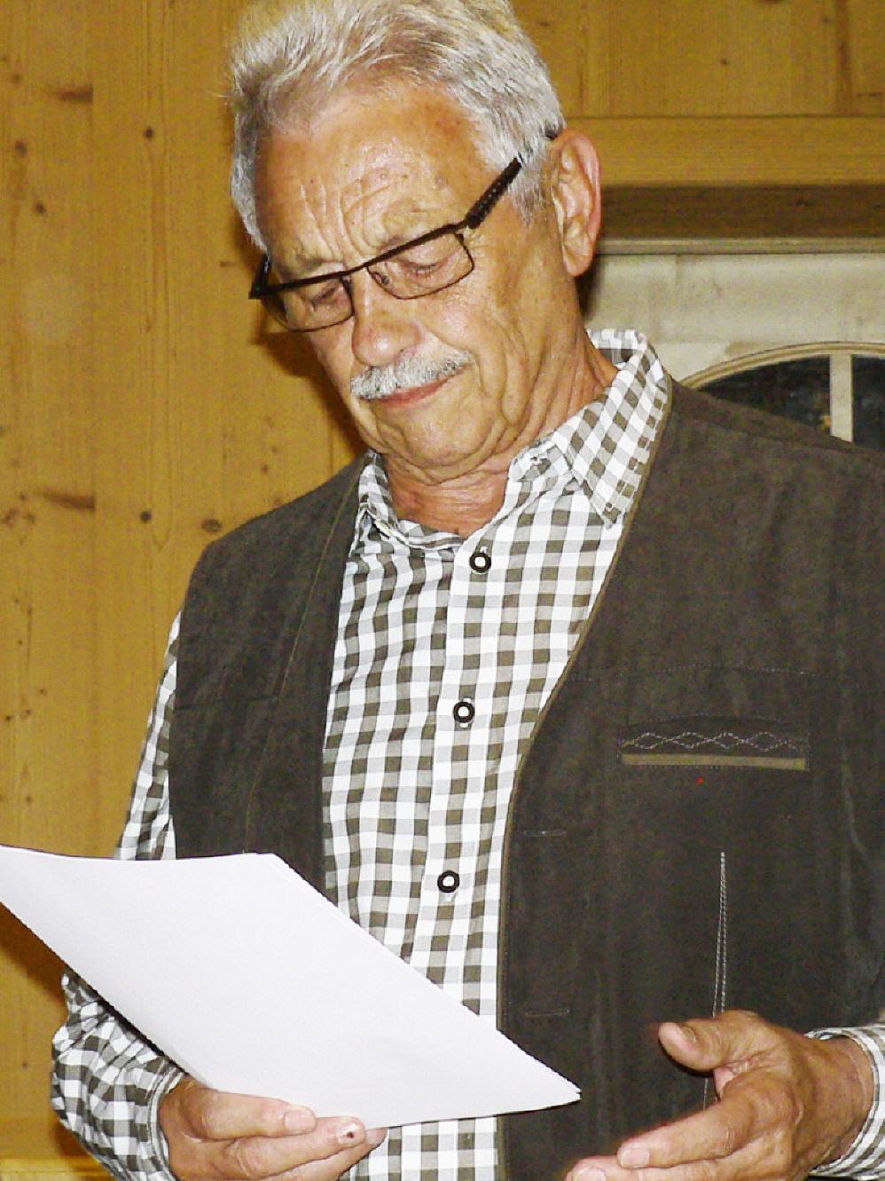 Mit großem Beifall bedacht, trug die Hochbetagte eine im Heimatdialekt verfasste Erzählung von Stedele kraftvoll und authentisch vor (Ausflug der Dettenschwanger Ministranten zu „Di Heiliga Bourgr“). Irmgard Schmid, eine weitere Freundin des örtlichen Dialekts, setzte mit Stedeles Erzählung „Zahnziacha in Thaining“ nach; auch sie eine überzeugend Vortragende. Es schloss sich dann ein Streifzug durch unmittelbar benachbarte Dialekte an. Marianne Spengler gab mit Reimen ihrer Tante Thekla Balser eine Kostprobe der in Ellighofen gesprochenen Mundartvariante. Lore Kienzl setzte den Abstecher fort mit oberbayerischen Reimen ihrer Schwester Lilly Zeiler zum Älterwerden. Und der aus Lechbruck stammende Hans Schütz schloss den Bogen, indem er mit eigenen, im Lechbrucker Dialekt geschriebenen Texten unterhielt, darunter das erzählende Gedicht „Striala“ aus seinem demnächst erscheinenden Buch mit Hörbuch. Es nimmt den Zuhörer mit auf einen an Schätzen reichen Dachboden und stöbert dort vielerlei Gegenstände der Vergangenheit wieder auf.