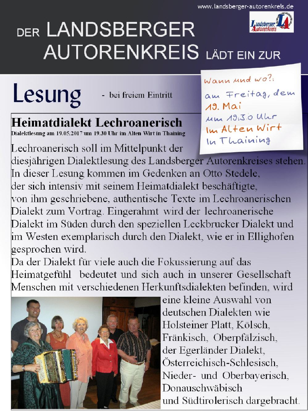 Wieder einmal lud der Landsberger Autorenkreis zu einer Mundart-Lesung, diesmal zum Alten Wirt in Thaining. Am Freitagabend, dem 19. Mai, fand sich dort eine erfreulich große Schar von Interessierten ein. Klaus Wuchner, ein Urgestein des Autorenkreises, eröffnete den Abend und moderierte den ersten Teil des Programms. Dabei ging es um den Heimatdialekt „Lechroanerisch“, den Schwerpunkt des Abends. Im Besonderen drehte es sich um den in Obermühlhausen geborenen Otto J. Stedele, 2014 verstorbenes Mitglied des Autorenkreises, einen passionierten Erforscher und Bewahrer der Lechroaner Mundart. Franziska Ostner aus Thaining war dabei seine rührige Mitstreiterin, und bis heute engagiert sie sich für die Dokumentation des Lechroanerischen der 1940er Jahre, um es zumindest für die Erinnerung zu bewahren.