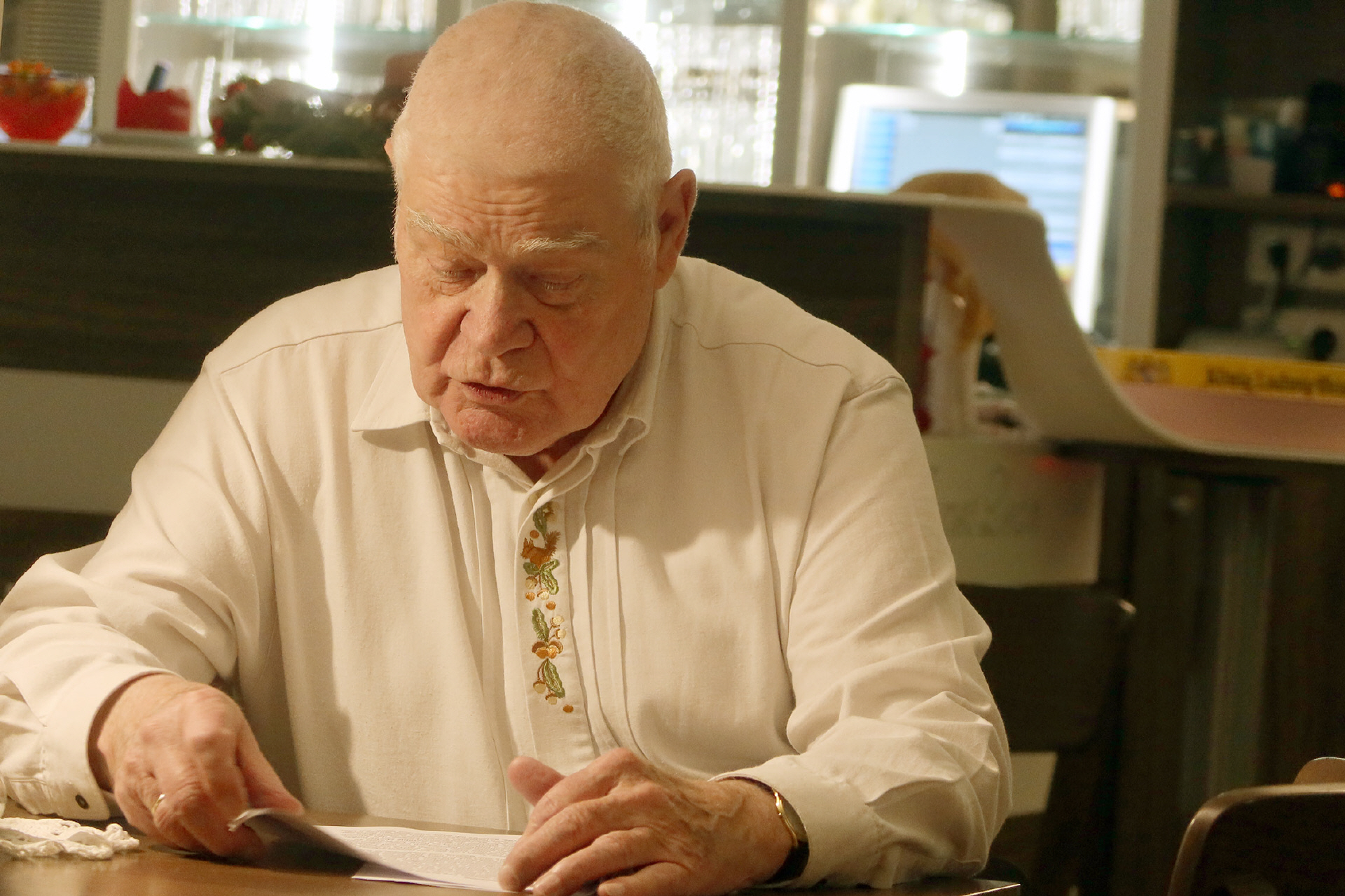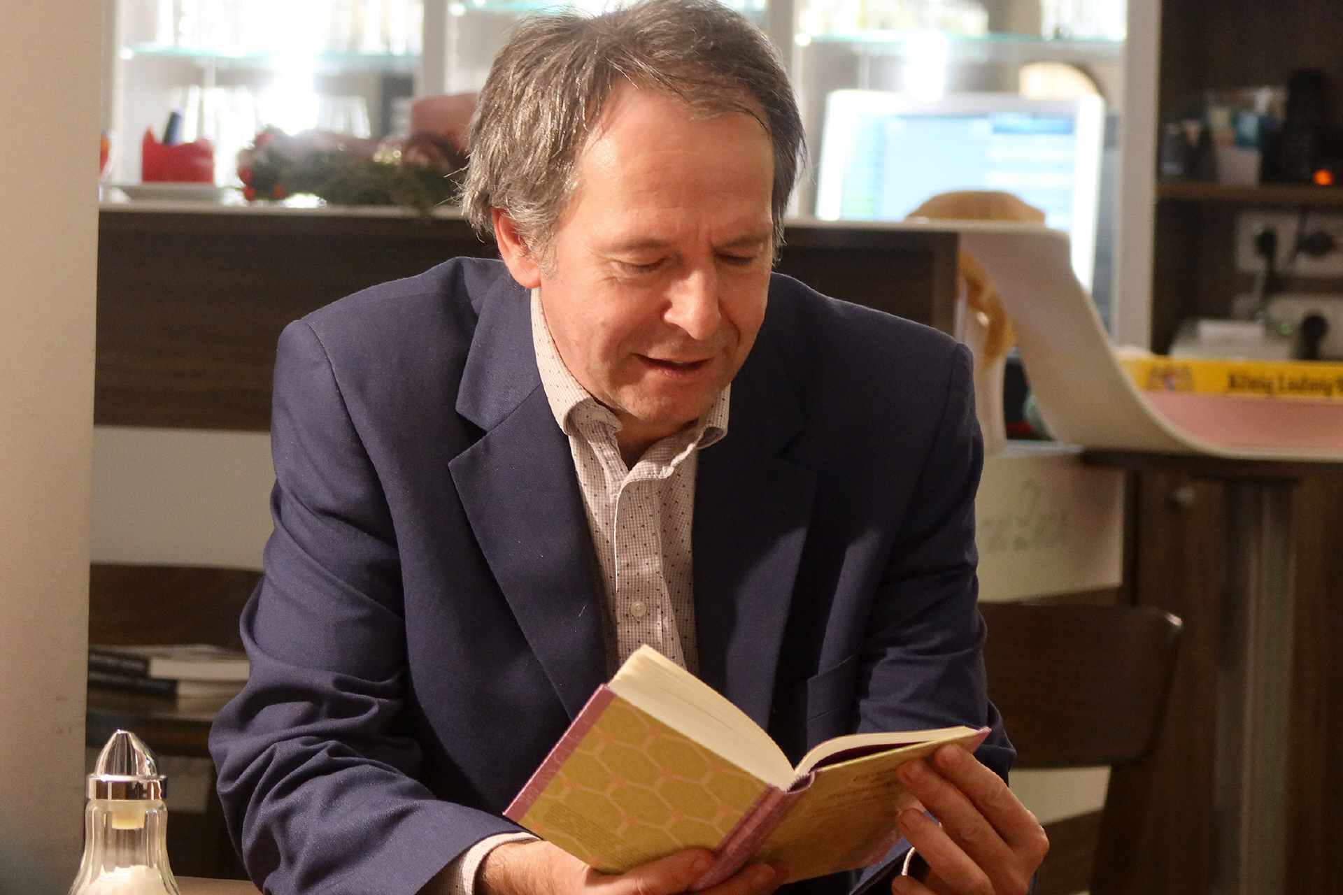 Überwältigt von der Vielzahl der Beiträge setzt sich am Schluss der Moderator selbst in den Schein der Leselampe. Auch Heiko D. Felbrici hat etwas dabei: die Geschichte des Fotos, das seine Einladung zierte, ein Winterspaziergang. Der Frost formte lange Eiskristalle in den Büschen, das Dorf war idyllisch verschneit, eine Brücke führte über den Bach mit seinem „Glitzern wie ausgestreute Diamantsplitter“ – der Winter ist ein Künstler, der unser Auge in diese Schönheit reinzieht. Doch die Fotos davon wirken flach, „meine Enttäuschung will mir die Freude nehmen“. Sie können nur beim Erinnern helfen: reifbehängte Zweige im Wasser, ein Baum im Bild. Schönheit in Vollkommenheit macht trunken, lädt ein zu einem stillen Gebet und dem Heimweg in Frieden.