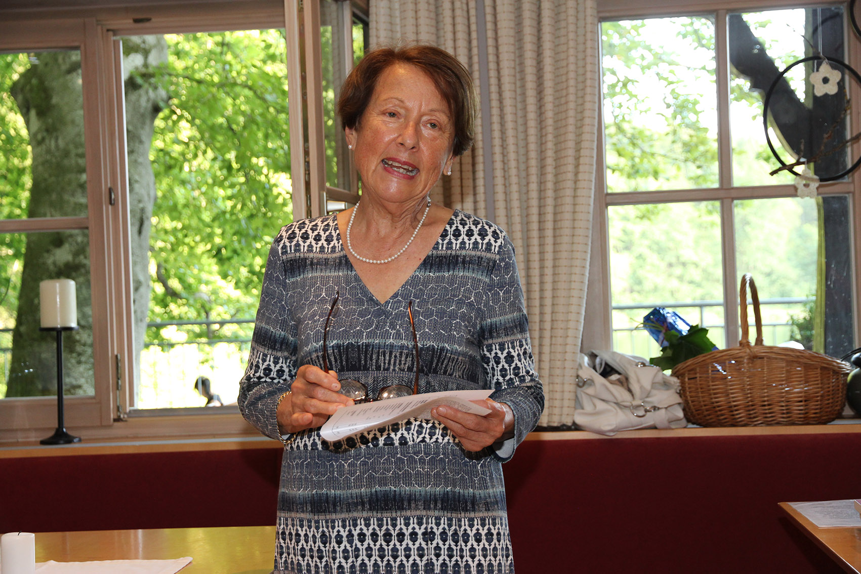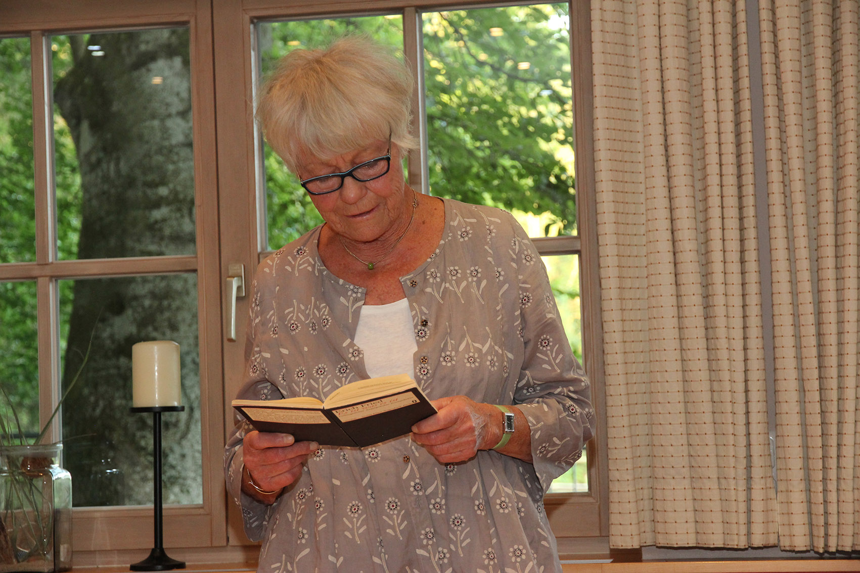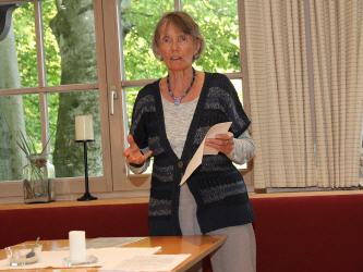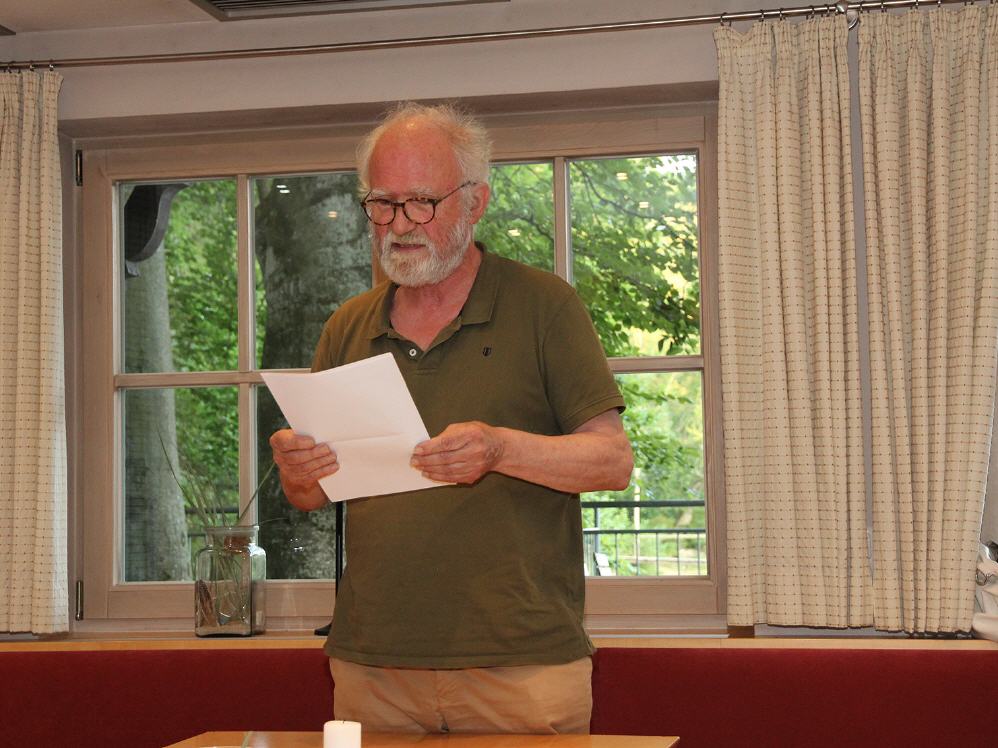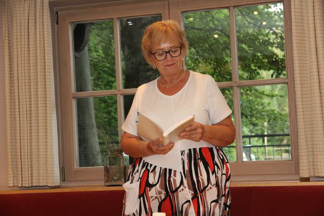 Mit dem Gedicht von Erich Fried „Eine Stunde“, in dem es um Wettrüsten und verhungernde Kinder geht, rüttelte Lore Kienzl die Zuhörer auf. Ihre eigenen beglückenden Gedanken über einen „Sonnigen Tag“ konnten die schweren Gedanken dann wieder etwas zerstreuen. Die Nixe Nanda will in Benno von Rechenbergs Erzählung Mensch werden, um auf Füßen tanzen zu können und trifft auf eine Internatsschülerin, die nachts an den See kommt. Bald leben sie in enger Freundschaft zusammen – und das Echo ihrer Lieder kann man nachts immer noch hören.