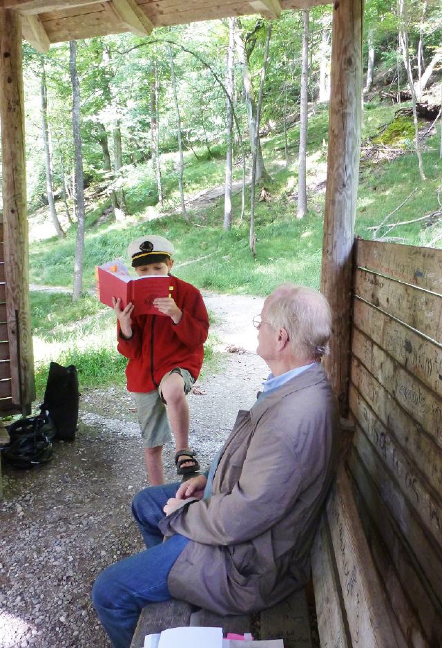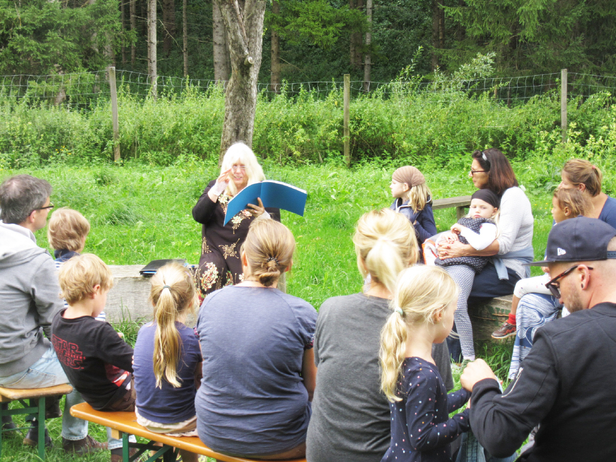 In der Nähe des Parkeingangs beim Pavillon am Kneippbad ging es in diesem Jahr lustig zu. „Fit in Vitalien und andere Naturalien“ hieß das Thema, dessen sich Heidenore Glatz und Gerwin Degmair angenommen hatten. Im Grünen Klassenzimmer bekamen Kinder, die sich eine der Kindergeschichten von Inifrau von Rechenberg oder Boris Schneider anhörten, einen großen Schusser oder mit Glück sogar eine bebilderte und signierte Version der gelesenen Geschichte geschenkt. Am alten Pumphaus las Angelika Müller Lyrik und Gurnemanz-Kurzgeschichten, von denen auch Helmut Glatz welche dabei hatte. Mit seinen fantastischen Geschichten nahm er die Zuhörer mit auf eine lustige Reise. Auch Thomas Glatz hatte neben seiner Gitarre zur musikalischen Untermalung Gurnemanz- und andere Kürzestgeschichten mit an seinen Leseort vor der Wildfütterung gebracht. Bei der Hütte am Biberaltwasser wartete Theresa Schermer mit „Geschichten von Oma und Opa“ und mehr auf die Zuhörer. Petra Hinterstößer trug, wie angekündigt, Überraschungsgedichte vor; vom witzigen Tatsachenbericht über Janas Gras bis zur nachdenklichen Gegenwart von Flüchtlingen und Tod ließen sich die Zuhörer sehr beeindrucken. Da diese Station am Ende der literarischen Wildpark-Wanderung lag, konnte die Autorin auf Wunsch noch einige Zugaben bis weit nach 17 Uhr geben.